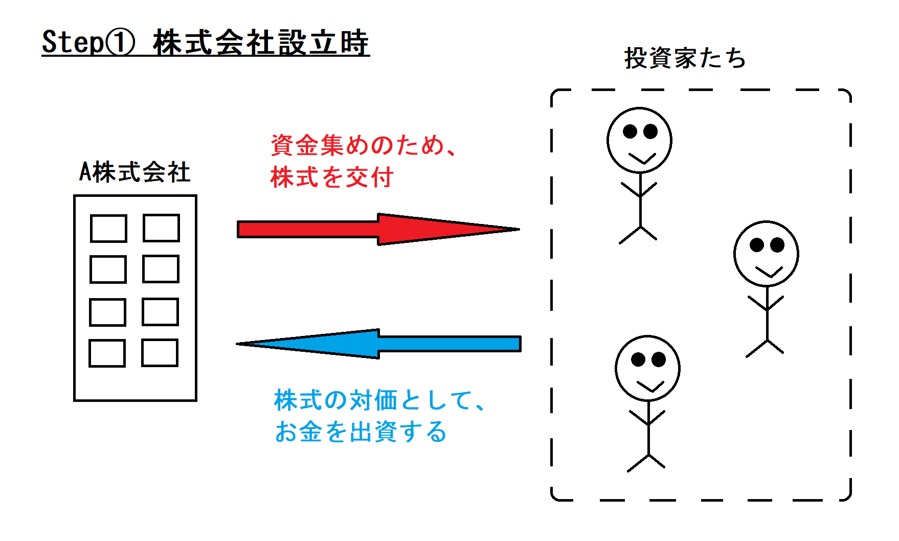株式会社は、投資家たちに「株式」を売ることで事業資金を集めます↓