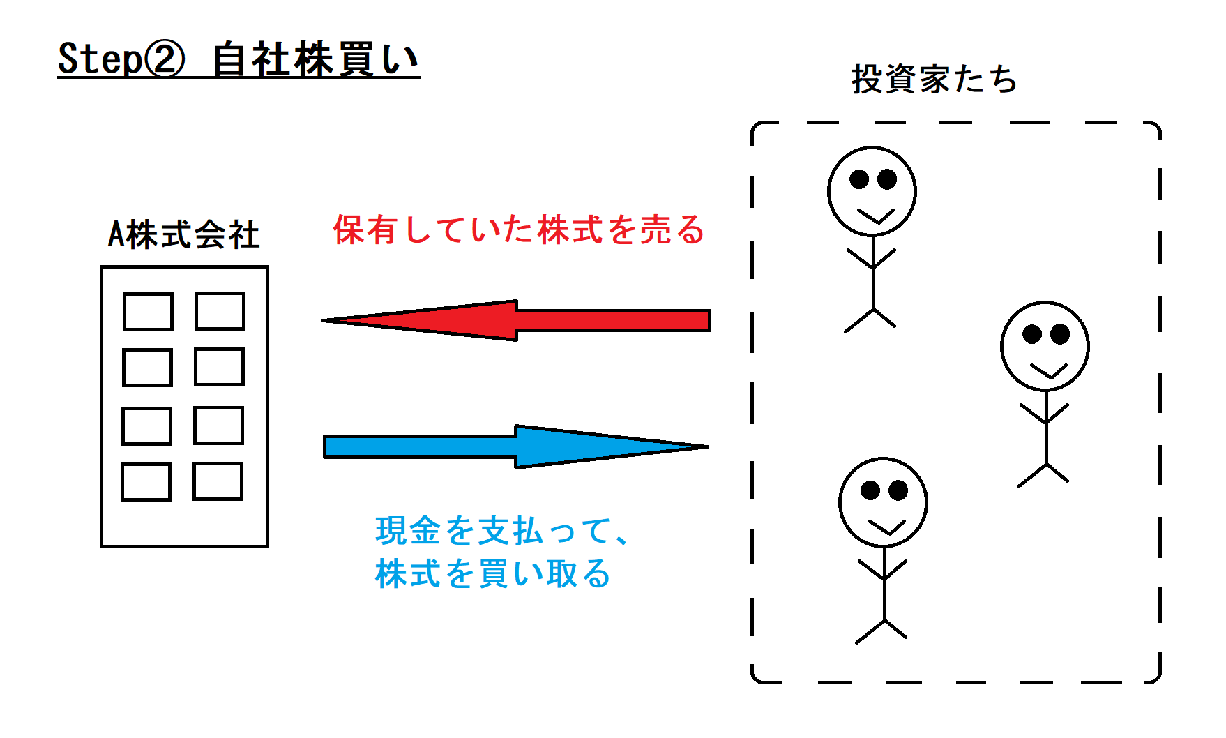 「自社株買い」は、上図で投資家たちに売った株式を、株式会社が買い戻すことを意味します↓